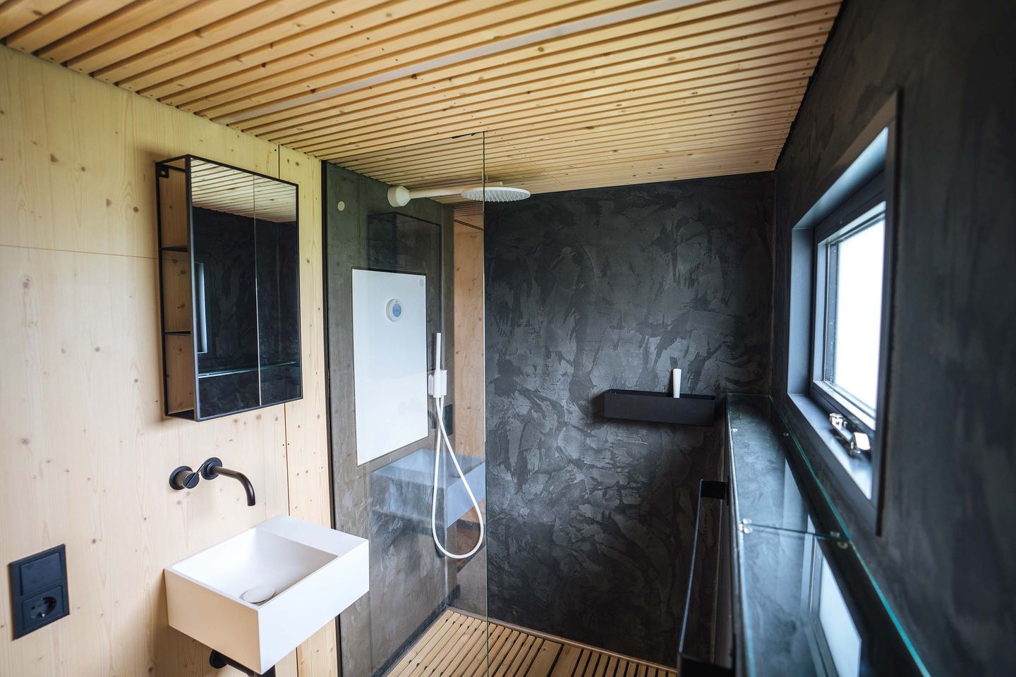 Das Tiny House Pioneer verfügt über ein eigenes Badezimmer mit einer nachhaltigen Astronautendusche, einem Waschbecken und einer Trenntoilette. Die smarte Astronautendusche reinigt, filtert und erhitzt das Wasser in Echtzeit und spart dadurch wertvolle Ressourcen. Bitte beachte, dass aktuell die Handbrause der Dusche defekt ist. Jedoch bietet die obere Regendusche einen hohen Duschkomfort. Wir hoffen, die Handbrause schnellstmöglich reparieren zu können und möchten die Unannehmlichkeiten im Voraus entschuldigen. Handtücher aus weichen Buchenholzfasern und feiner Bio-Baumwolle sorgen für weniger Gerüche und längere Frische. Da sich das Green Tiny Village Harlesiel am Rand des UNESCO-Weltnaturerbes Wattenmeer befindet, gibt es vor Ort keine herkömmliche Kanalisation. Daher ist das Tiny House mit einer umweltbewussten Trenntoilette ausgestattet, die ohne Wasserspülung auskommt und gleichzeitig komfortabel in der Nutzung ist.